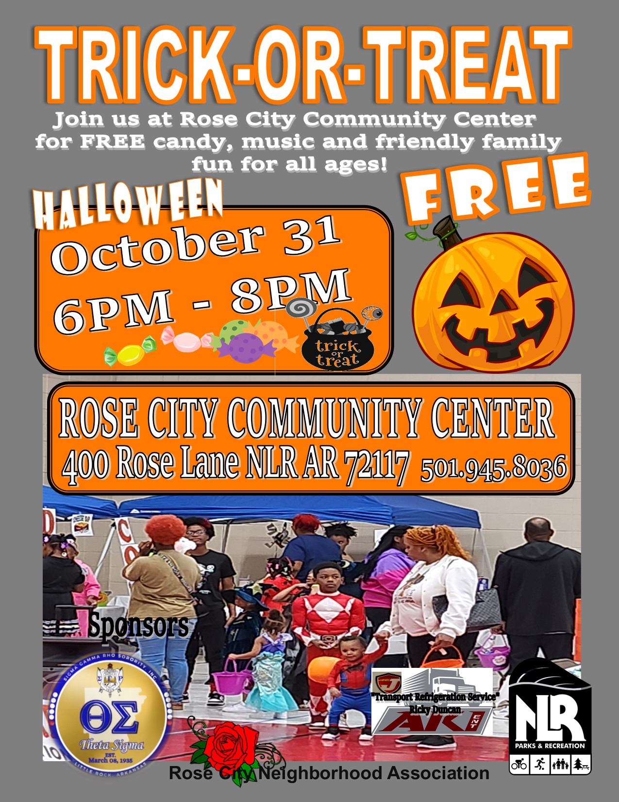 Oct 31 6:00 pm – 8:00 pm Trick or Treat at Rose City CC Rose City Community Center 400 Rose Lane, North Little Rock Event Details Get Directions