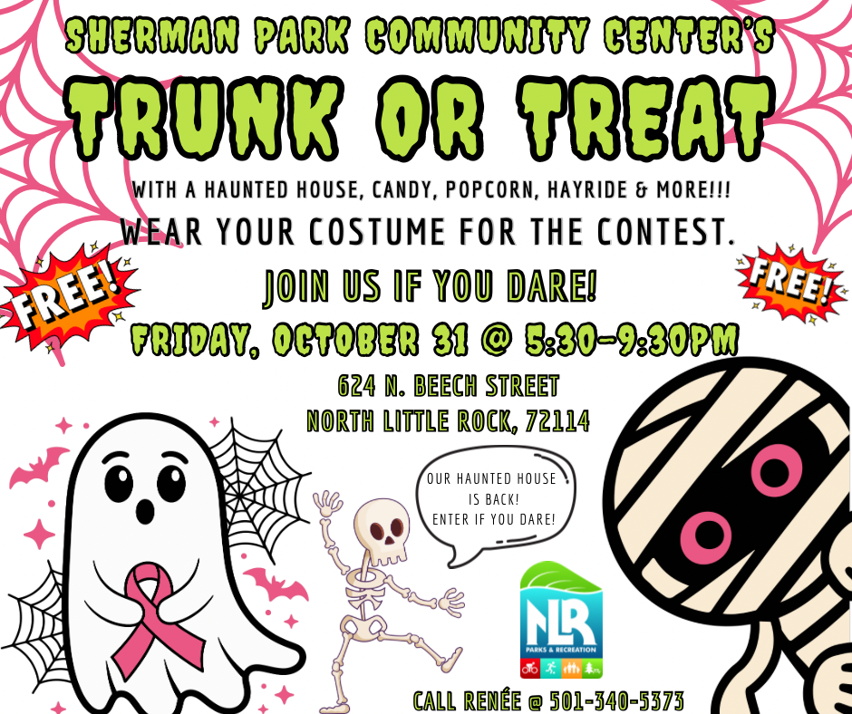 Oct 31 5:30 pm – 9:30 pm Trunk or Treat at Sherman Park CC Sherman Park Community Center 624 Beech Street, North Little Rock Event Details Get Directions